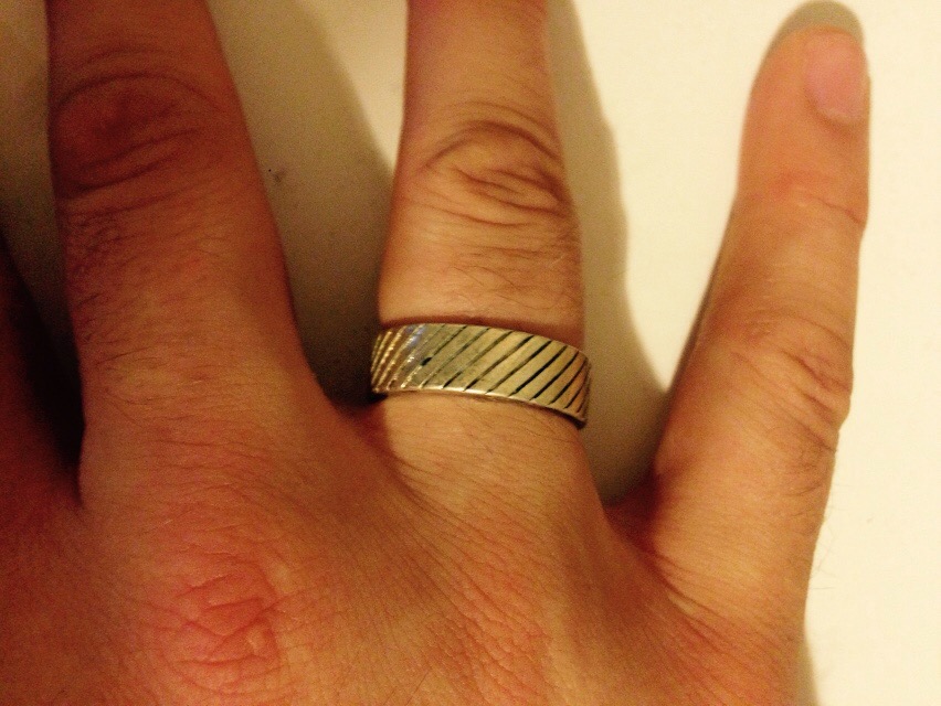 This ring was a gift. I like it very much, but am not a massive jewellery wearer (short of my wedding ring and my St Christopher, I don’t even wear a watch!) but I wanted to give this ring an outing so today was the day! The metal has a diagonal etching on it, and what I like most about it is its chunkiness! It’s a dull finish rather than a shiny one and for a few quid, why the hell not!!!!!