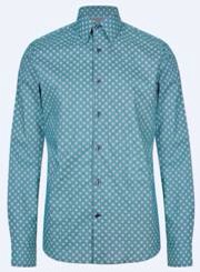 Sometimes you just need a good print to play around with! The geometry in the print plays against the fitted structured lines in the pattern and creates this lovely statement shirt. For me this is a pop of colour and design from below a jacket or sweater. (skinnier guys can afford to show more of this shirt off) but all in all this is a lovely piece, it seems much closer to a Teal tone and there for will play nicely against deeper and darker tones.