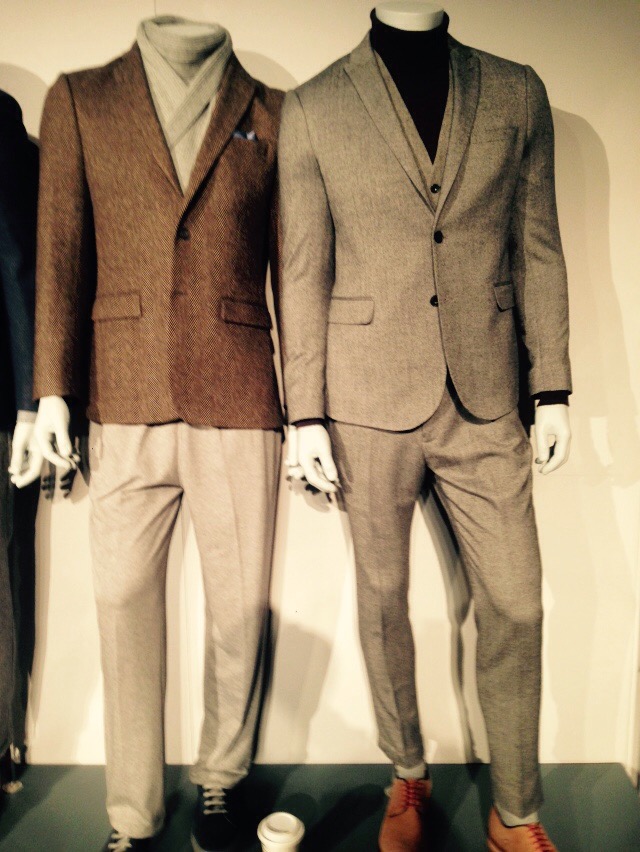 On the left we have jogging bottoms paired with a lovely light tweed jacket and a scarf (a really lovely weekend look or a less formal approach to workplace style) and on the right this fantastic three-piece suit which is full of detail in this statement grey, and will be retailing for just £129.00! This has got to be the bargain of the collection. It is a high quality cut with three adaptable pieces that will make this extremely wearable (tailored to a wide size range), and this shade of grey means that this is universally wearable for casual or more formal situations.