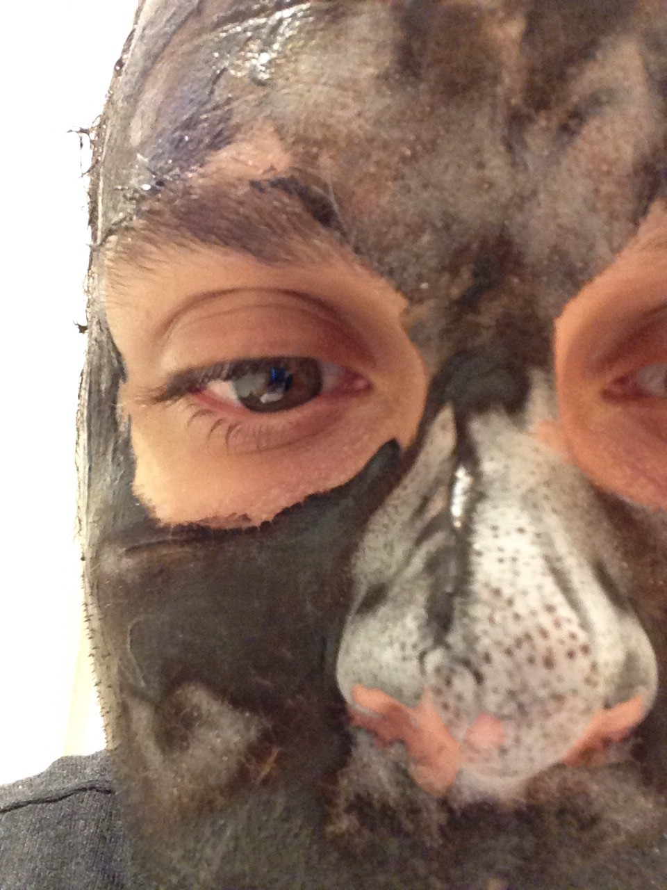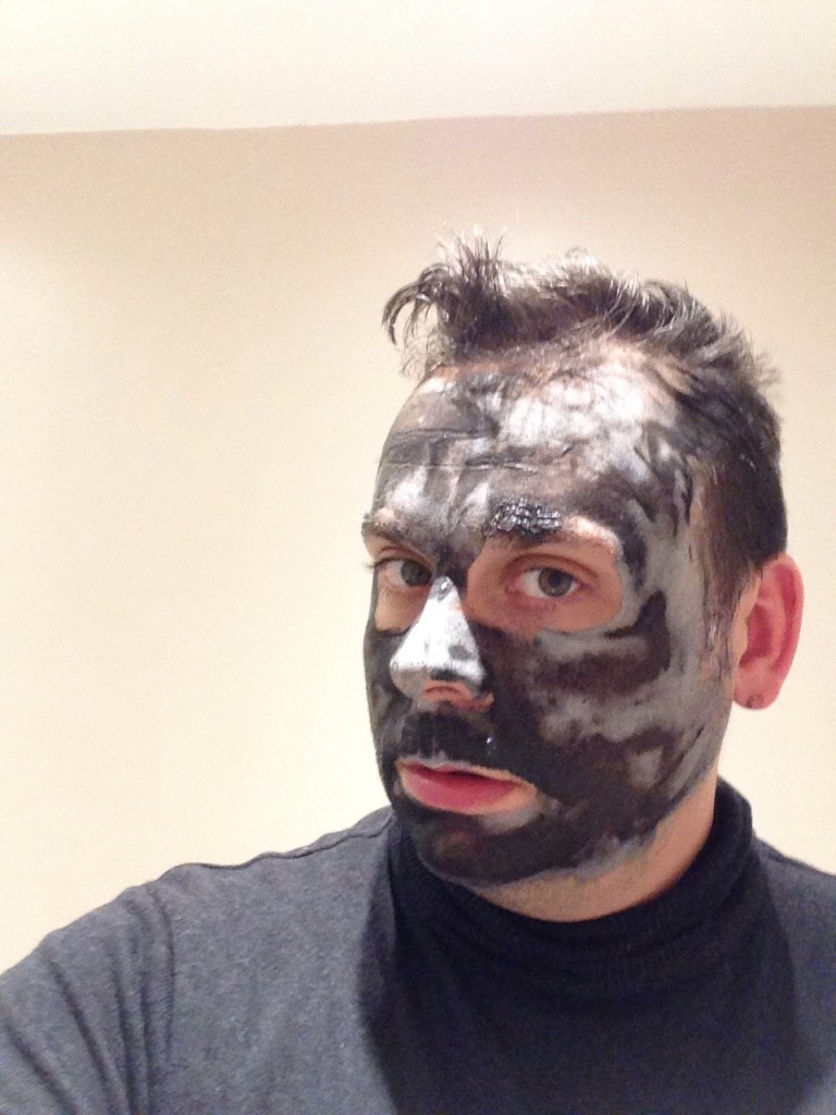 Avoiding the eyes I covered the whole face right up to and over the hairline. This means that my skin that is prone to spots behind the hairline also has the chance to get super clean! I then let my body heat do the work and dry the mask from black to grey!