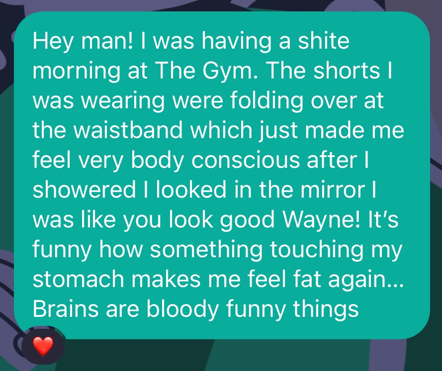 I have learned that sometimes it’s good to talk these things through. So I hit up a mate on IG who really is an excellent listener. A man who is open, honest and supportive. And through this conversation I realised that I wasn’t alone, that a lot of people feel this way, and that a problem shared is a problem halved.